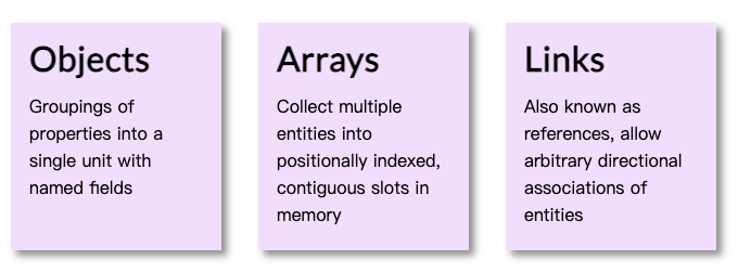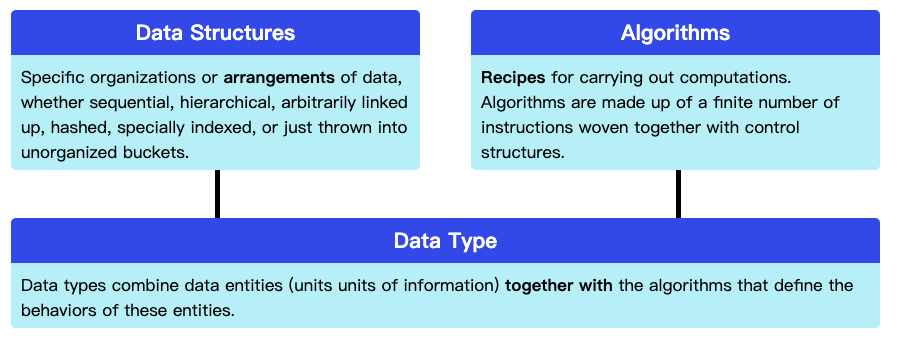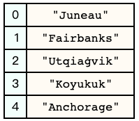 Of the many subfields within computer science, algorithms and data structures may be the most fundamental—it seems to characterize computer science like perhaps no other. What is involved in the study of algorithms and data structures? data structures and algorithms were mentioned together. Why? It’s very helpful to think of the data type as the bridge between data structures and algorithms. So these data types are the key to everything right? What are they, exactly? First of all, note that programs manipulate information, and information in a program is represented with entities. Entities are things like numbers, text, lists, and so on. To help us understand entities, it helps to classify them into types. We have an intuition about what types are. As a first approximation, a type is just a set of values, for example: That’s not really good enough, though! The reason why entities have certain types is that they behave in certain ways: you can multiply numbers, reverse lists, capitalize text, block users, revoke credentials, promote employees, and so on. Properly specifying a type requires defining how the entities of that type behave. These behaviors are captured (algebraically 😮😮😮) as operations with zero or more inputs and a single output. For example: The same thing can be said without pictures, for example: Ah, now we have behaviors. A data type is a set of values together with operations that define their behavior. Abstract Data Types A useful exercise is to identify things in your world and try to list as many behaviors as you can. Here is a starter set: A data structure is an arrangement of data for the purpose of being able to store and retrieve information. Usually a data structure exists in order to provide a physical representation of a data type. For example, a list (a data type, which we saw above) can be represented by an array (a data structure) or by attaching a link from each element to its successor (another kind of data structure). Wait, what are arrays and links? Data structures are built with three primary structuring mechanisms: Let’s dive in. A object, also known as an record, struct, or named tuple, is a single entity that has many properties, where each property has a name and a value, which is another entity. Here is a simple object, can you guess what it represents? An array is an entity that has a number of constituent elements, packed tightly together in memory and indexable by small natural numbers. In most programming languages, the first index is 0, in others (Julia, Lua, MATLAB), the first index is 1. Here are some cities in Alaska to visit (in order, because arrays are ordered): Important: Note that were the properties of a object come together to make one conceptual thing; arrays are generally thought of as a collection of distinct things.