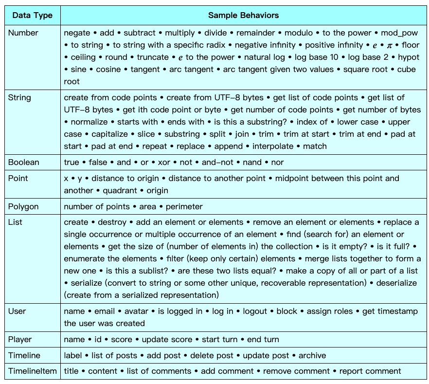 As an aside: you will sometimes hear the term abstract data type, abbreviated “ADT.” People use this term to emphasize the fact that the “internal structure and internal workings of the operations” are somehow unknown to the outside world. Only the effects of the operations matter. To many people, though, saying “data type” is enough—all datatypes are “abstract” in that sense.