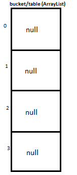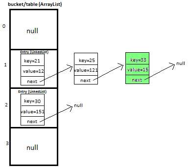 I will be explaining how we will put and get key-value pair in HashMap by overriding We will maintain bucket (ArrayList) which will store Entry (LinkedList). We store key-value pair by using Entry<K,V>,Entry contains I will explain you the whole concept of HashMap by putting 5 key-value pairs in HashMap. Initially, we have bucket of capacity=4. (all indexes of bucket i.e. 0,1,2,3 are pointing to null) Let’s put first key-value pair in HashMap,Key=21, value=12,newEntry Object will be formed like this We will calculate hash by using our hash(K key) method - in this case it returns key%capacity = 21%4= 1. So, 1 will be the index of bucket on which newEntry object will be stored. Let’s put second key-value pair in HashMap: Key=25, value=121 , newEntry Object will be formed like this: key%capacity= 25%4= 1 Let’s put third key-value pair in HashMap:Key=30, value=151,newEntry Object will be formed like this We will calculate hash by using our hash(K key) method - in this case it returns At completion of this step, our HashMap will look like this: Let’s put fourth key-value pair in HashMap: Key=33, value=15,Entry Object will be formed like this At completion of this step our HashMap will look like this https://www.javamadesoeasy.com/2015/02/hashmap-custom-implementation.html