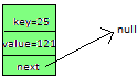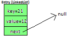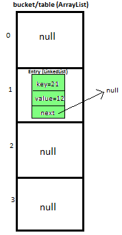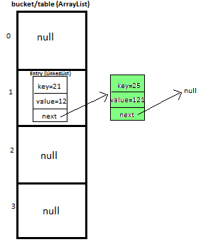 So, 1 will be the index of bucket on which newEntry object will be stored. We will go to 1st index, it contains entry with key=21, we will compare two keys(i.e. compare 21 with 25 by using equals method), as two keys are different we check whether entry with key=21’s next is null or not, if next is null we will put our newEntry object on next.