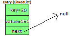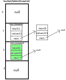 key/capacity= 30%4= 2. So, 2 will be the index of bucket on which newEntry object will be stored. We will go to 2nd index as it is pointing to null we will put our newEntry object there.