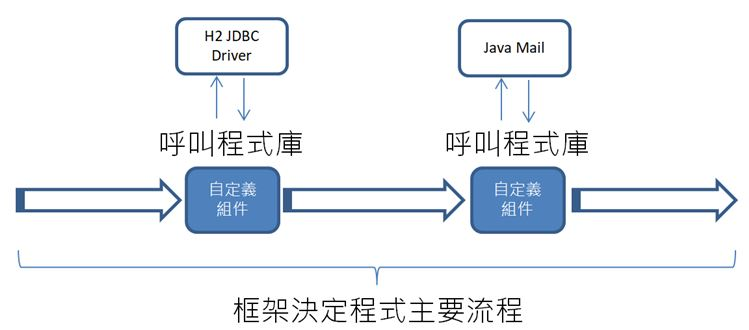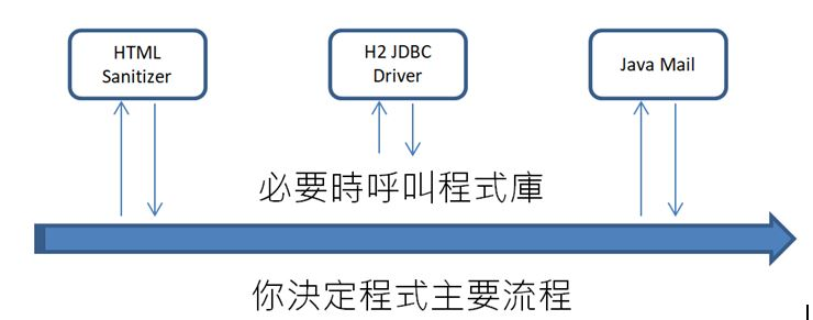 在開發應用的過程中,會使用一些程式庫,例如,應用程式也許使用了 OWASP 的 HTML Sanitizer、H2 JDBC 驅動程式、Java Mail 等,然而,應用程式程式主要流程一直在你的控制之內,你決定了何時要處理請求參數、取得模型物件、轉發請求、顯示頁面等各式流程。 控制、熟悉應用程式的流程走向,是很重要的一部份,在打算套用框架之前,你必須先認清應用程式的流程走向,至少,你應該寫個原型,試著摸出、掌握大致的流程走向,這對後續框架的選擇、使用會有很大的幫助。 因為在開始使用框架之後,會發現框架將主導程式運行的某個流程,你必須在框架的規範下定義某些類別,框架會在適當時候調用你實作的程式元件,也就是說,對應用程式的流程控制權會被反轉,框架會規範、限制應用程式流程,框架會呼叫你的程式元件,而不是由你來呼叫框架。 例如,使用程式庫的話,主要流程的控制是這樣的: 灰色部份是可以自行掌控的流程,並在過程中必要時機,引用各種程式庫,當然,執行程式庫的過程中,會暫時進入程式庫的流程,不過,絕大多數的情況下,你對應用程式的主要流程,還是擁有很大的控制權。 使用框架的話,主要流程的控制是這樣的: 這就是控制權反轉(Inverse of Control, IoC)的解讀之一,使用框架的話必須注意,流程控制權會從你的手中反轉至框架身上! 當然,框架本質上也是個程式庫,不過會被定位為框架,表示它對程式主要流程擁有更多的控制權,然而,框架本身是個半成品,想要完成整個流程,必須在框架的流程規範下,實現自定義元件,如上圖表示的,灰色部份是可以自行掌控的部份,與使用程式庫相比,對流程控制的自由度少了許多。 應用程式開發時是否需要使用框架,有很多考量點,然而簡單來說,使用程式庫時,開發者會擁有較高的自由度;使用框架時,開發者會受到較大的限制。 若應用程式本身不複雜,不需要套用任何框架就可以完成這項任務,那麼就不要使用框架,因為若要使用框架,往往必須按照框架的規範實作定義檔、設定相關數值、依一定方式取得元件等,若應用程式本身並不複雜,在享用到框架的益處之前,就會被一堆繁瑣規範或設定給困擾,產生「有必要這麼複雜嗎?」的疑惑,若框架本身又很龐大,光是學習、掌握到熟練框架,也會付出很大的成本。 然而,如果應用程式在主要流程、組合元件甚至管理元件生命週期管理等需求上,自行撰寫程式碼完成任務已成沉重負擔之時,而框架對這些需求,若能大致符合既有之需求,套用框架可省去自行撰寫、維護元件生命週期等程式碼的麻煩,這時換取而來的益處超越了犧牲掉的流程自由度,才會使得使用框架具有意義。 類似地,想要套用 Spring MVC 之類的 Web 框架嗎?那要先問自己,應用程式打算遵照或已經是 MVC 流程架構了嗎?如果不是,那使用 Spring MVC 並不會為你帶來益處,反而會感到處處受限,正如股市有句名言:「好的老師帶你上天堂,不好的老師帶你住套房。」用框架時可以這麼想:「好的框架帶你上天堂,不好的框架帶你住套房。」 在程式設計相關的領域中,名詞多半沒有嚴謹的定義,這邊談到的 Inversion of Control,是在使用任何框架前必須要有的認知,然而,並不是 Spring IoC 核心中的 Inversion of Control 概念,由於經常有人將兩者混淆在一起,後來 Martin Fowler 建議使用 Dependency Injection 來取代 Spring 中 對 IoC 的稱呼。 https://openhome.cc/Gossip/Spring/IoC.html