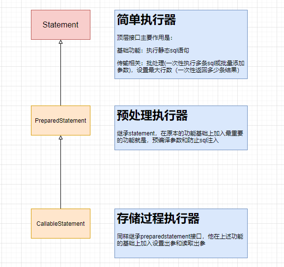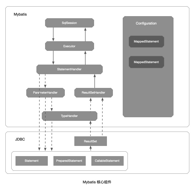 众所周知,Mybatis是对JDBC的封装,那底层肯定是JDBC,那是不是很有必要回顾一下jdbc。先写一段代码 执行过程如下图所示: 先来看看JDBC的Statement,statement的重要作用就是设置sql参数然后执行sql,先来看看jdbc的三种sql处理器: 关于防止sql注入,Statement是直接发送静态sql执行,而PreparedStatement 发送的是sql(这边会带问号)以及若干参数组,参数需要转义进去,所有的转义操作都在数据库端执行,并不是在我们的应用层转义的。 Statement 中常规方法 编码示例: 各个组件的功能以及注意事项如下图: Executor是MyBatis执行接口,执行器的功能如下: Executor有主要的三个实现子类。分别是:SimpleExecutor(简单执行器)、ReuseExecutor(重用执行器)、BatchExecutor(批处理执行器)。 SimpleExecutor是默认执行器,它的行为是每处理一次会话当中的SQl请求都会通过对应的StatementHandler 构建一个新个Statement,这就会导致即使是相同SQL语句也无法重用Statement,所以就有了(ReuseExecutor)可重用执行器 ReuseExecutor 区别在于他会将在会话期间内的Statement进行缓存,并使用SQL语句作为Key。所以当执行下一请求的时候,不在重复构建Statement,而是从缓存中取出并设置参数,然后执行。阅读源码可以知道其实里面就包含一个statementMap,执行的时候看一下是否存在,如果有了就不需要新构建statement了,这也说明为什么执行器不能跨线程调用,这会导致两个线程给同一个Statement 设置不同场景参数。 BatchExecutor 顾名思议,它就是用来作批处理的。但会将所有SQL请求集中起来,最后调用Executor.flushStatements() 方法时一次性将所有请求发送至数据库。 三个示例的代码: 这边批处理执行器想必大家觉得和上面有所不一样吧,为什么他不写查询,其实他如果写查询的话和上面的SimpleExecutor 一样,他有批处理功能,和上面jdbc的批处理一样,他是一条sql,设置多个参数过去,然后执行。而ReuseExecutor 是设置一次参数执行一次,设置一次执行一次。还是有本质的区别 前面我们所说Executor其中有一个职责是负责缓存维护,以及事务管理。上面三个执行器并没有涉及,这部分逻辑去哪了呢?别急,缓存和事务无论采用哪种执行器,都会涉及,这属于公共逻辑。所以就完全有必要三个类之上抽象出一个基础执行器用来处理公共逻辑。 BaseExecutor 基础执行器主要是用于维护缓存和事务。事务是通过会话中调用commit、rollback进行管理。重点在于缓存这块它是如何处理的? (这里的缓存是指一级缓存),它实现了Executor中的query与update方法。会话中SQL请求,正是调用的这两个方法。Query方法中处理一级缓存逻辑,即根据SQL及参数判断缓存中是否存在数据,有就走缓存。否则就会调用子类的doQuery() 方法去查询数据库,然后在设置缓存。在doUpdate() 中主要是用于清空缓存。 BaseExecutor 只有一级缓存,那二级缓存其实是在CachingExecutor,那为什么不把它和一级缓存一起处理呢?因为二级缓存和一级缓存相对独立的逻辑,而且二级缓存可以通过参数控制关闭,而一级缓存是不可以的。综上原因把二级缓存单独抽出来处理。抽取的方式采用了装饰者设计模式,即在CachingExecutor 对原有的执行器进行包装(明白点就是CachingExecutor 包含了一个Executor,这里为三大子类执行器,子类拥有父类的方法基本就是指向了父类BaseExecutor的方法),处理完二级缓存逻辑之后,把SQL执行相关的逻辑交给实际的Executor处理(交由BaseExecutor 以及其子类处理)。 从Mybatis执行过程的图中我们可以知道,SqlSession是调用Executor,从源码中可看成SqlSession实现中,其实包含一个Executor(二级缓存)。这样整个流程就串起来了,咱们以sqlsession的查询方法的selectList方法为例(因为select方法最终都会调到selectList) 如何创建会话以及如何将执行器包装成CachingExecutor又是另一个话题了 主要为了说明一下statement 这里为jdbc的statement, 假如我们用会话调用两个不同的方法,然后里面的sql是一样的,这里说的一样只是参数不同,那我们会预编译几次呢?下面代码示例 打印结果 从代码证明也就执行一次预编译。会话期间内所有的相同sql都只预编译一次即可 上面是重用执行器,预编译一次,那我们试一下批量执行器,小编前面说过,批量执行器需要使用修改的方法,那我们换一下代码: 执行结果表明,这边statement预编译一次即可 紧接着我们继续修改一下测试用例: 打印结果 从上面可有看出,相同sql语句在一起的与分开的是不一样的,只有连续相同的SQL语句并且相同的SQL映射声明,才会重用Statement,并利用其批处理功能。否则会构建一个新的Satement然后在flushStatements() 时一次执行。这么做的原因是它要保证执行顺序。跟调用顺序一致性。 MyBatis⽀持⽤插件对四⼤核⼼对象(Executor、StatementHandler、ParameterHandler、ResultSetHandler)进⾏拦截,对mybatis来说插件就是拦截器,⽤来增强核⼼对象的功能,增强功能本质上是借助于底层的 动态代理实现的,换句话说,MyBatis中的四⼤对象都是代理对象。 MyBatis所允许拦截的⽅法如下: SqlSource接口很简单,只有一个getBound方法: 它有很多实现,需要我们重点关注的是StaticSqlSource,RawSqlSource和DynamicSqlSource。在正式学习他们前,我们先了解一下Mybatis动态SQL和静态SQL的区别。 动态SQL表示这个SQL节点中含有 而静态SQL是不含以上这个节点的SQL,能直接解析得到含有占位符形式的SQL语句,而不需要根据传入的条件确定SQL,因此可以在加载时就完成解析。所