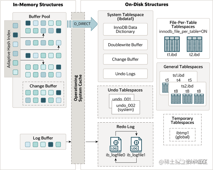 所以在选择哪个引擎的时候要根据实际业务选择,比如某个业务只会插入一次数据,后面的都只有查询,那么我就建议使用MyISAM,如果需要支持事务那就用InnoDB。 由于我们平时使用多的还是InnoDB引擎,所以这里主要剖析下InnoDB的存储结构(MyISAM和InnoDB在存储结构上是类似的) 5.7和8.0有些许不一致,主要是系统表空间的一些内容会移动到单独的表空间中去 为了保证数据不丢失,我们的数据必须要落盘,但是如果每次增删改查都去操作磁盘,那效率太低了,所以mysql会在内存中抽象出一份数据结构和磁盘一一对应,这样我们每次的增删改查就会优先操作内存中的数据。 咱们插入的数据是存储在磁盘的,而平时我们通过Navicate或者shell查询出来的数据,展现形式为表格,并不代表我们的数据也是这样直接这样存储在磁盘上的,磁盘上的数据有自己的格式。 比如我们将数据存在在文件是这样存储的 将内存中数据刷新到磁盘并不是一条数据一条数据从内存刷新到磁盘的,为了效率,InnoDB将数据划分为若干个页,以页作为磁盘和内存之间交互的基本单位,InnoDB中页的⼤⼩⼀般为 16KB,和磁盘上默认的页大小一致。 也就是在⼀般情况下,⼀次少从磁盘中读取16KB的内容到内存中,⼀次少把内存中的16KB内容刷新到磁盘中。 而内存数据结构主要分为 Buffer Pool(缓冲池) 和 Log Buffer(日志缓冲),它们管理的都是页,而页中存储的是数据。 https://z.itpub.net/article/detail/3E097E5138AA4A892D4BA75704C34B07整体架构