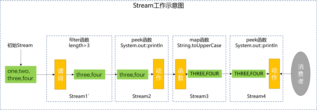 以下面一段函数(来自peek函数的官方注释)为例解释peek和map两个函数工作机制的不同: 输出如下: 工作示意图如下: 工作流程概述: map函数对Stream中元素执行的是映射操作,会以新的元素(map的结果)填充新的Stream,严格的讲map不是修改原来的元素。peek只能消费Stream中的元素,是否可以更该Stream中的元素,取决于Stream中的元素是否是不可变对象。如果是不可变对象,则不可修改Stream中的元素;如果是可变对象,则可以修改对象的值,但是无法修改对象的引用。 作者:大哥你先走