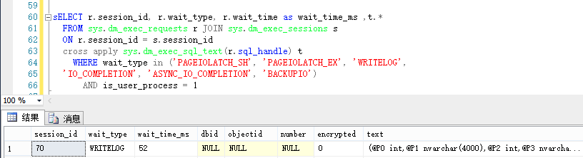 SELECT r.session_id, r.wait_type, r.wait_time as wait_time_ms ,t.*
